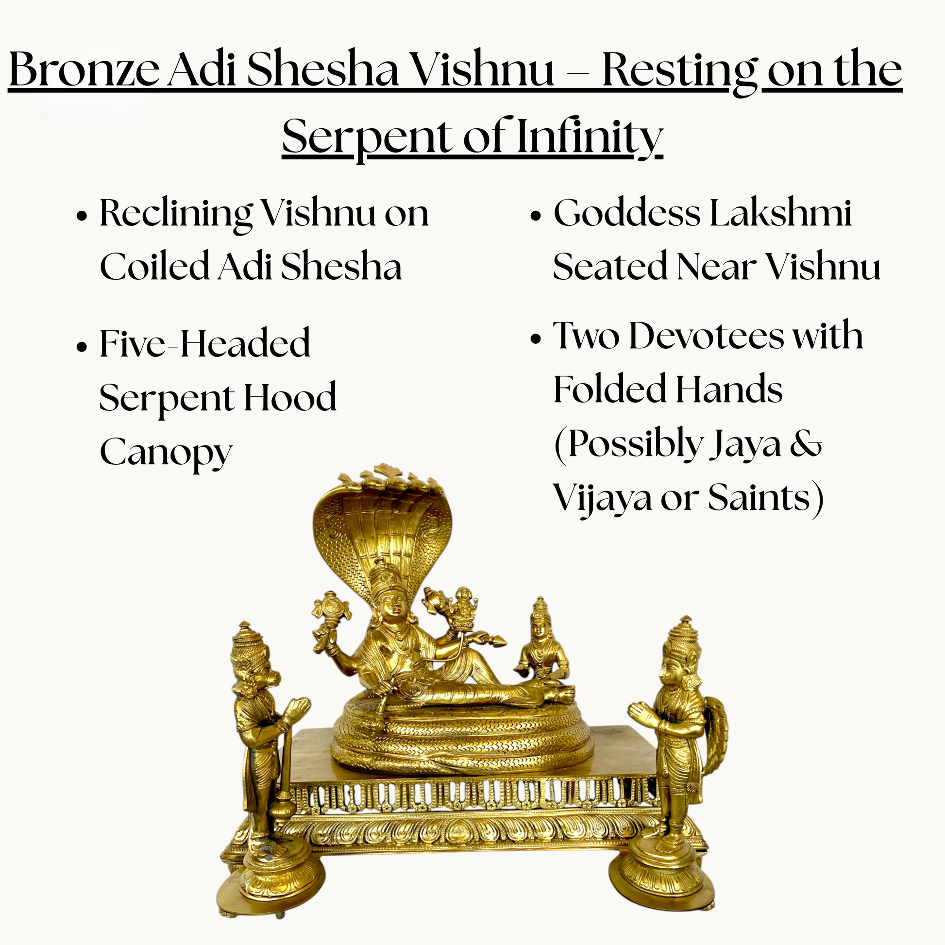Invite divine blessings and timeless tradition into your home with this Bronze Lord Vishnu Idol in the iconic Padmanabhaswamy posture - resting on the multi-headed Sheshnaag serpent, symbolizing cosmic protection and spiritual stability. This exquisitely crafted idol blends sacred symbolism and artistry - a perfect choice for pooja rooms, home temples, living rooms, or as a gift for spiritual occasions.