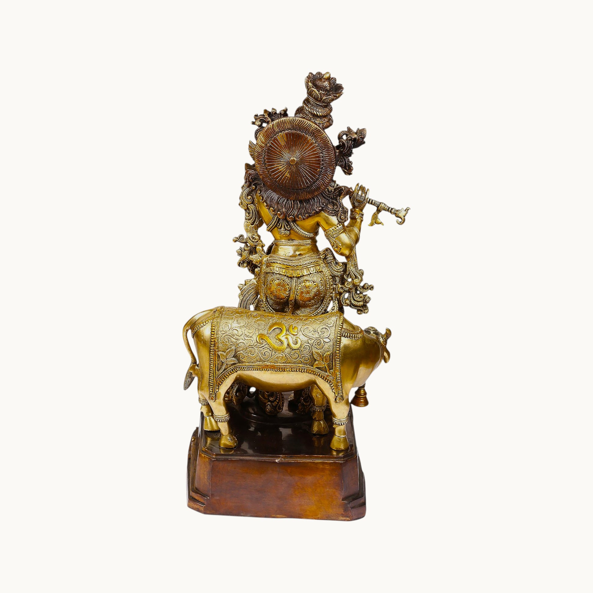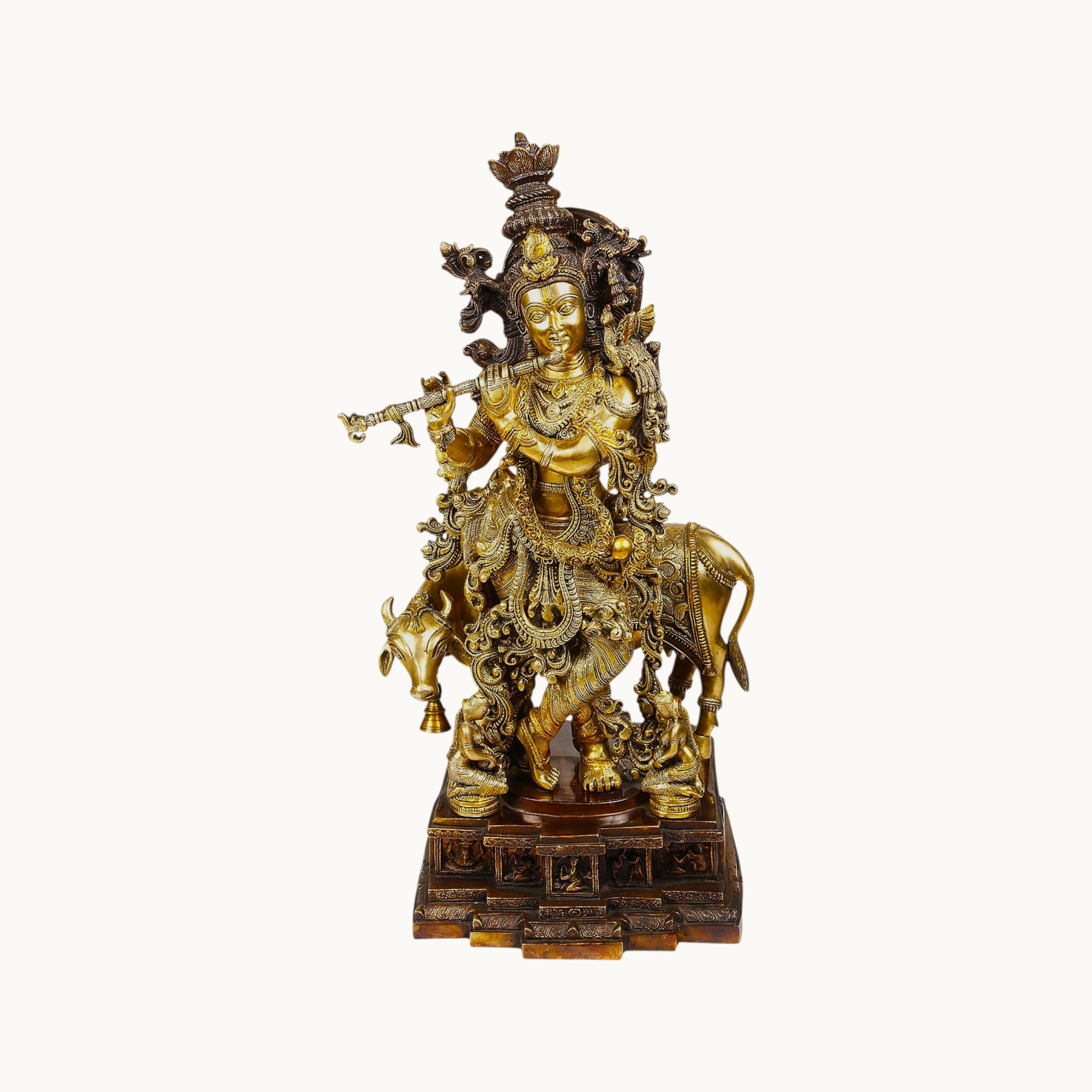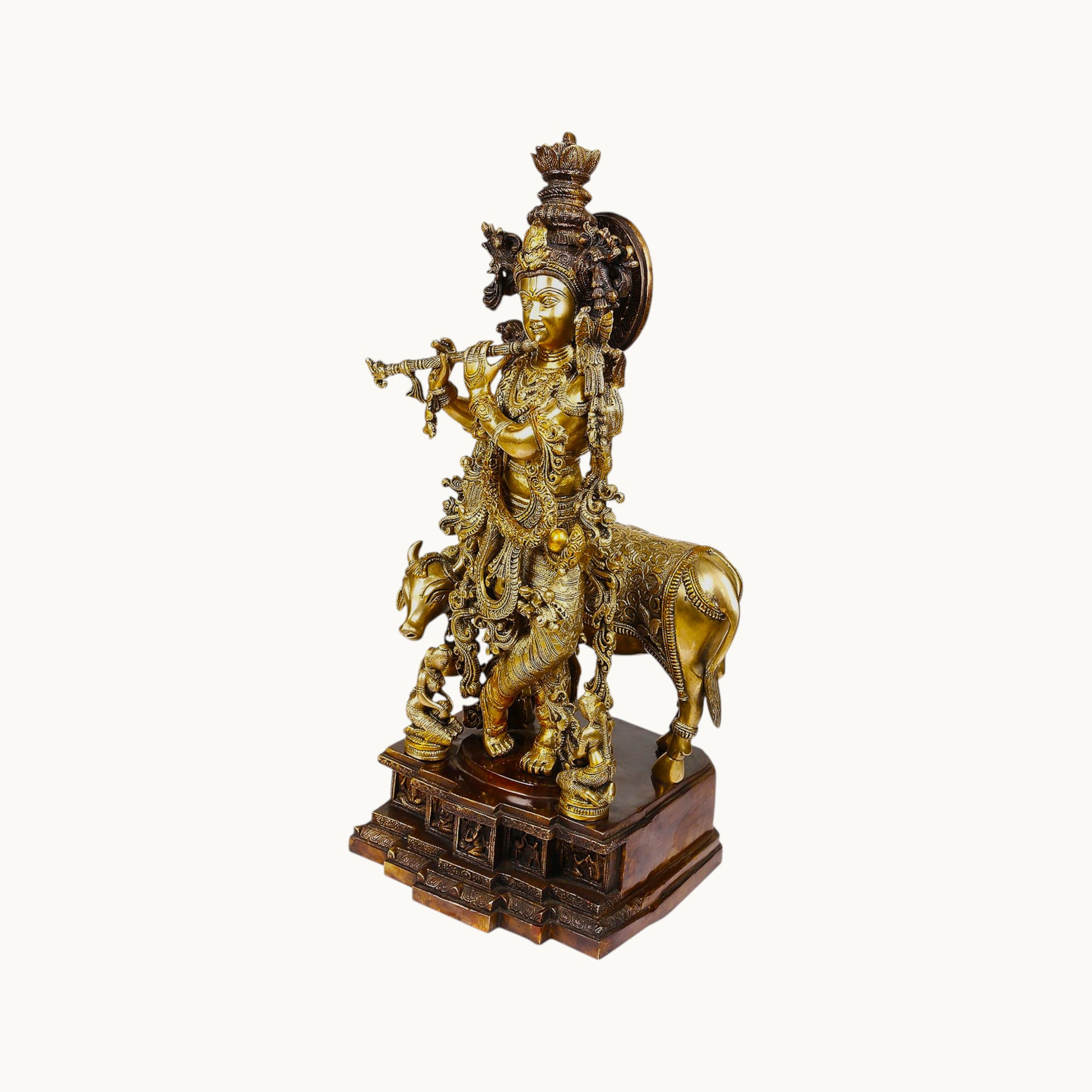 • Design: Crafted in brass with intricate details, depicting Krishna playing the flute or standing gracefully, with a cow at his base, symbolizing his connection to nature and divine love