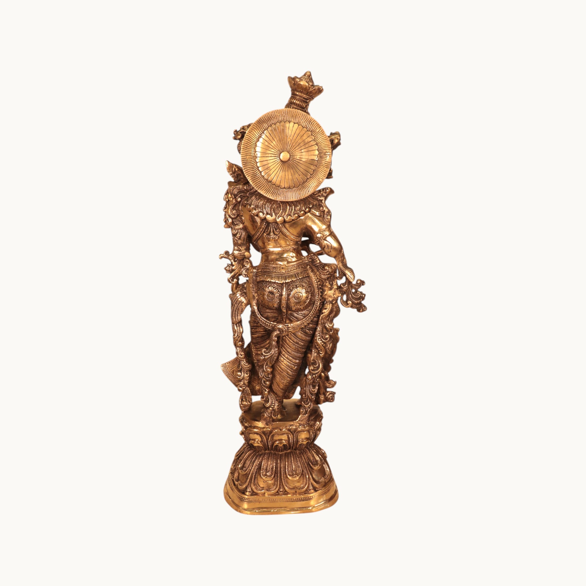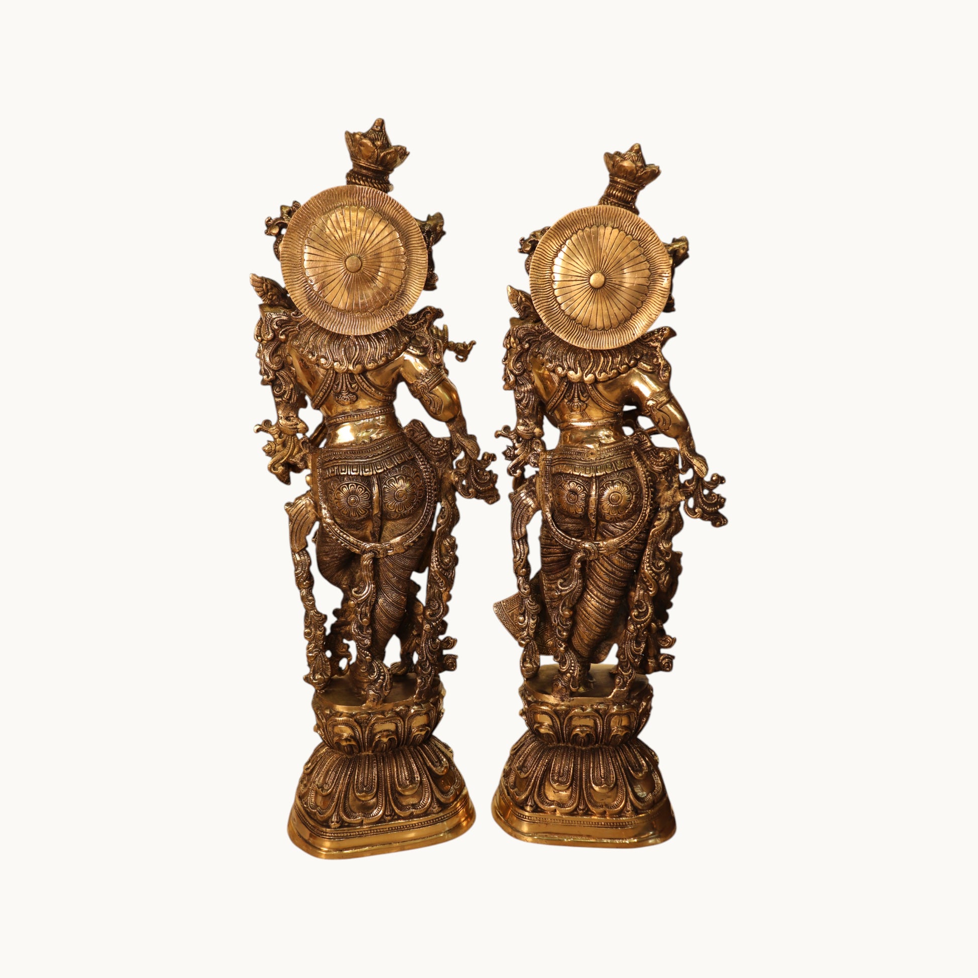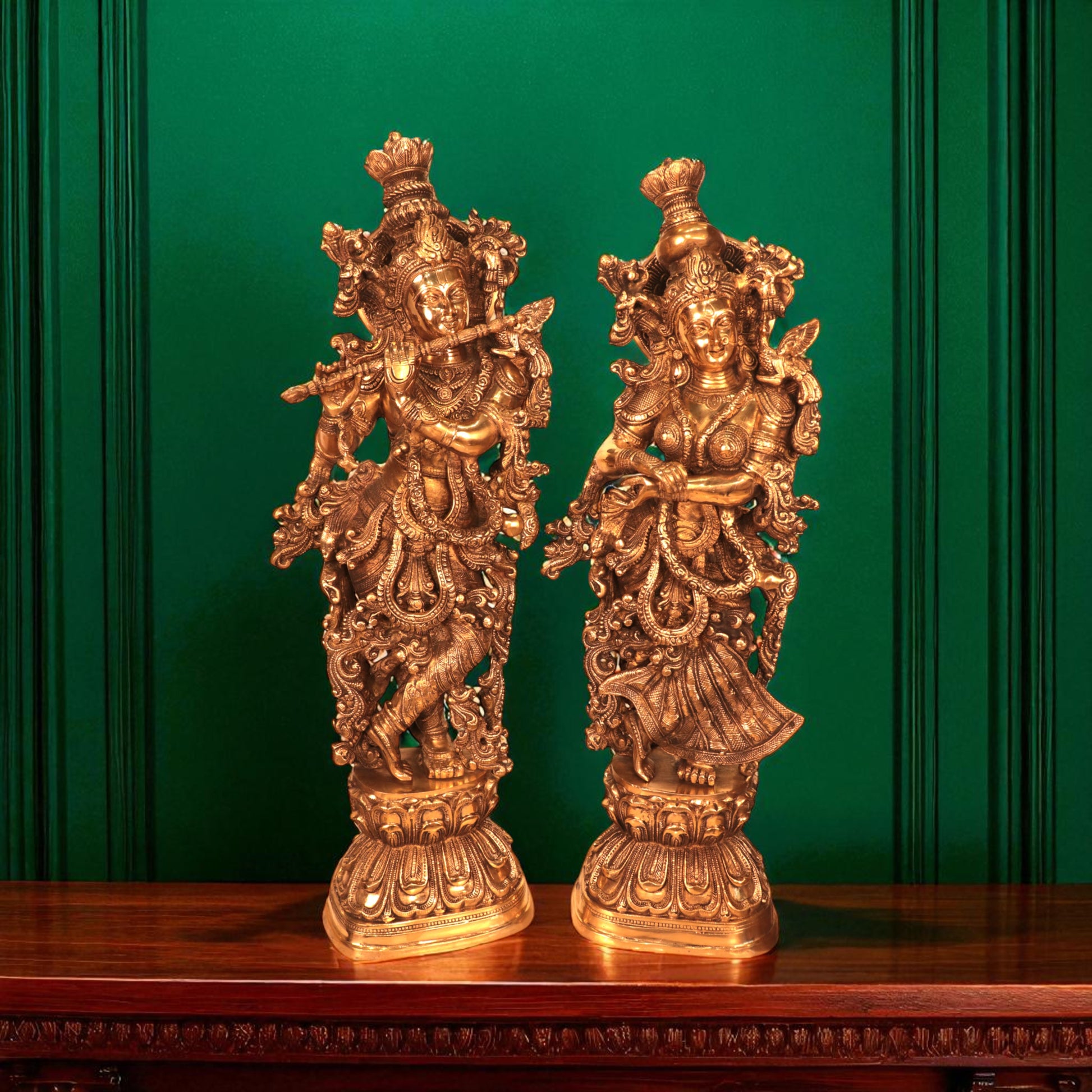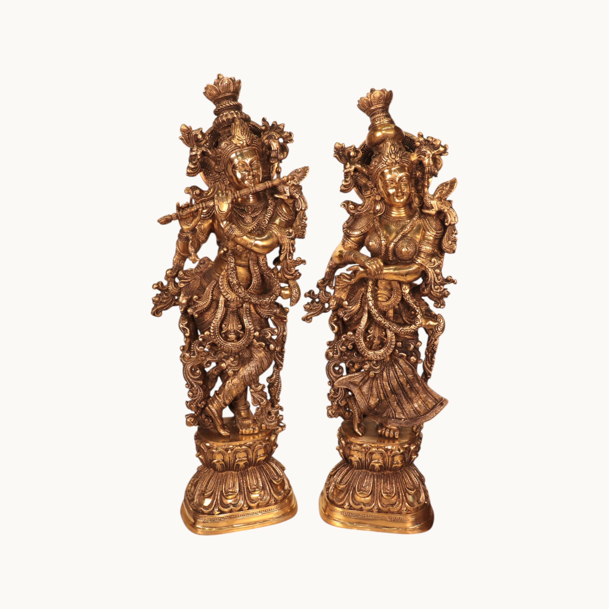 • Design: Crafted in brass with intricate details, depicting Radha and Krishna standing or seated together, often with Krishna playing the flute, symbolizing their divine love