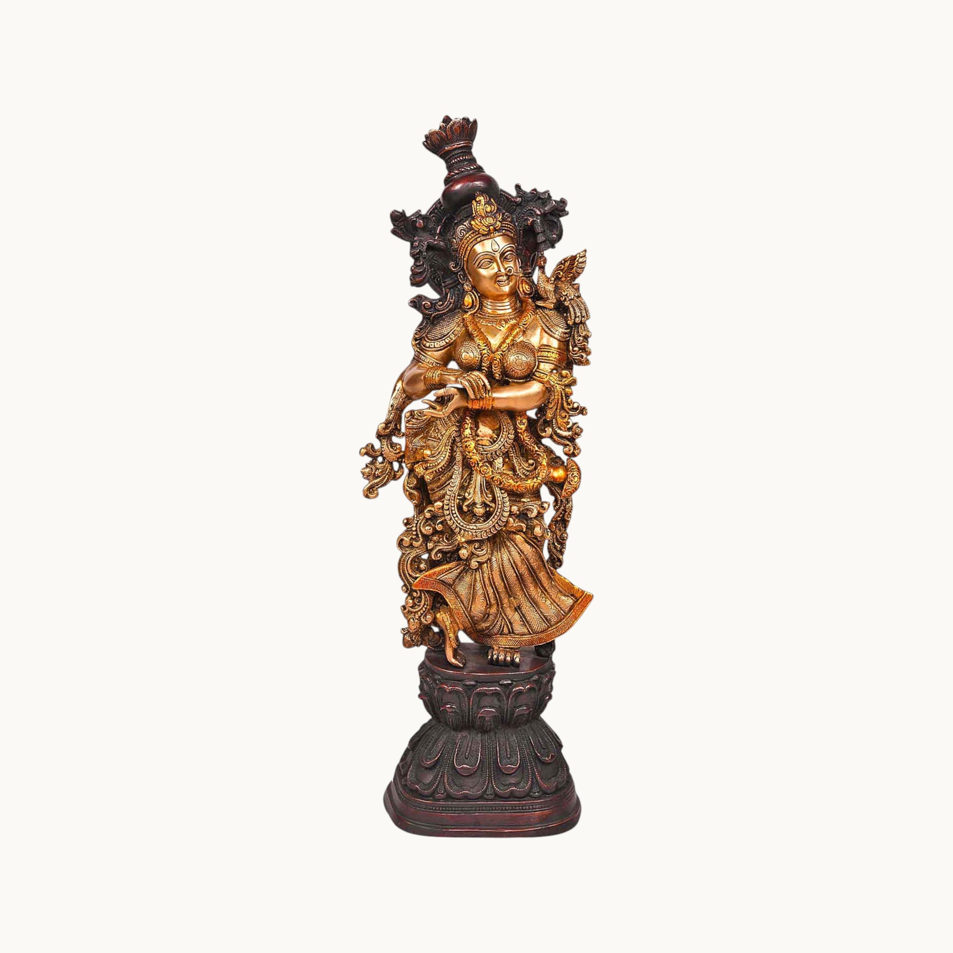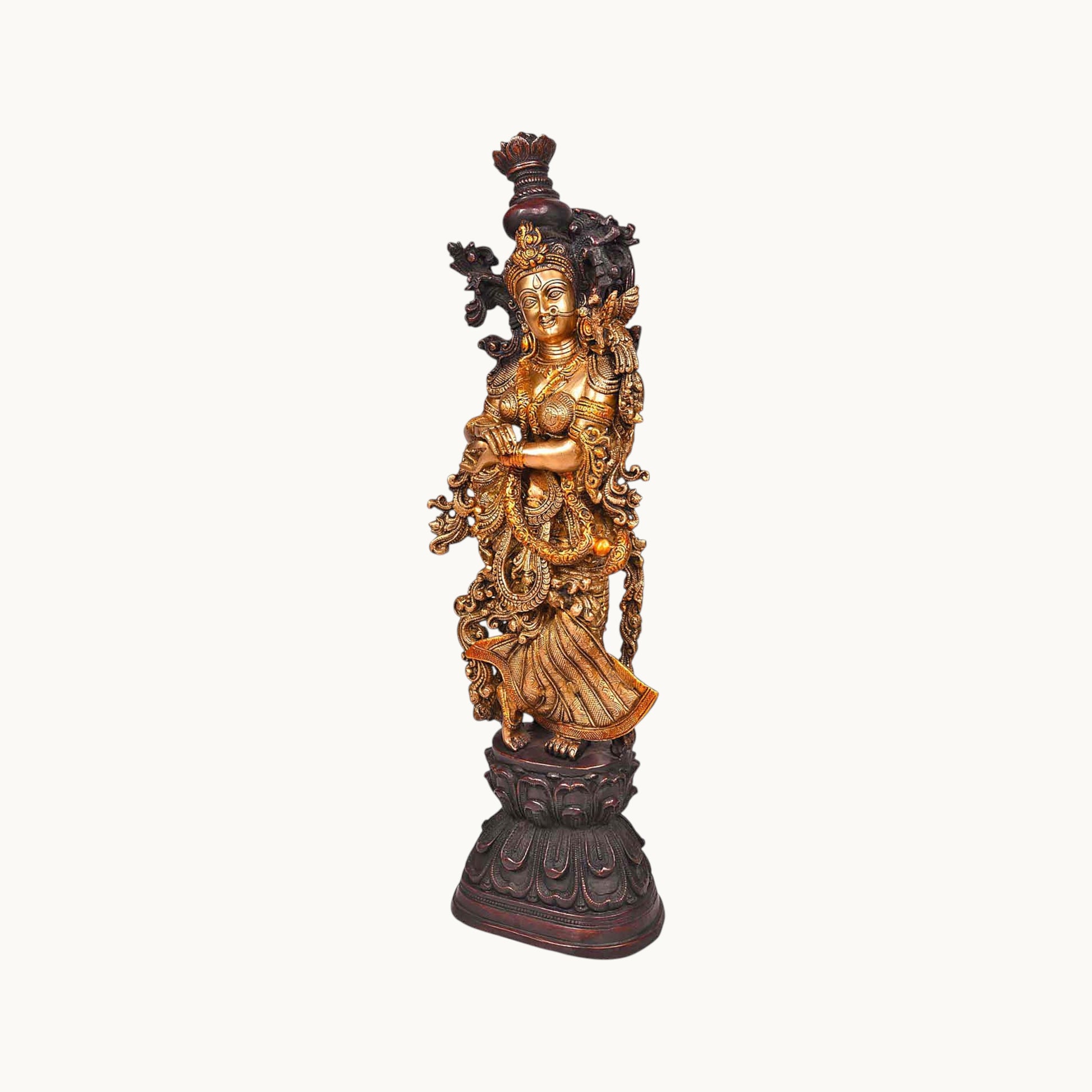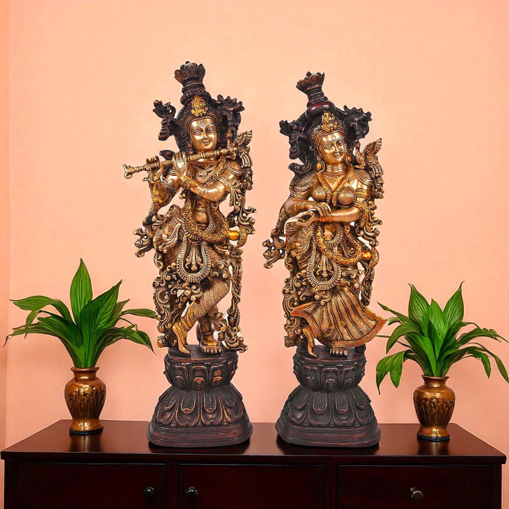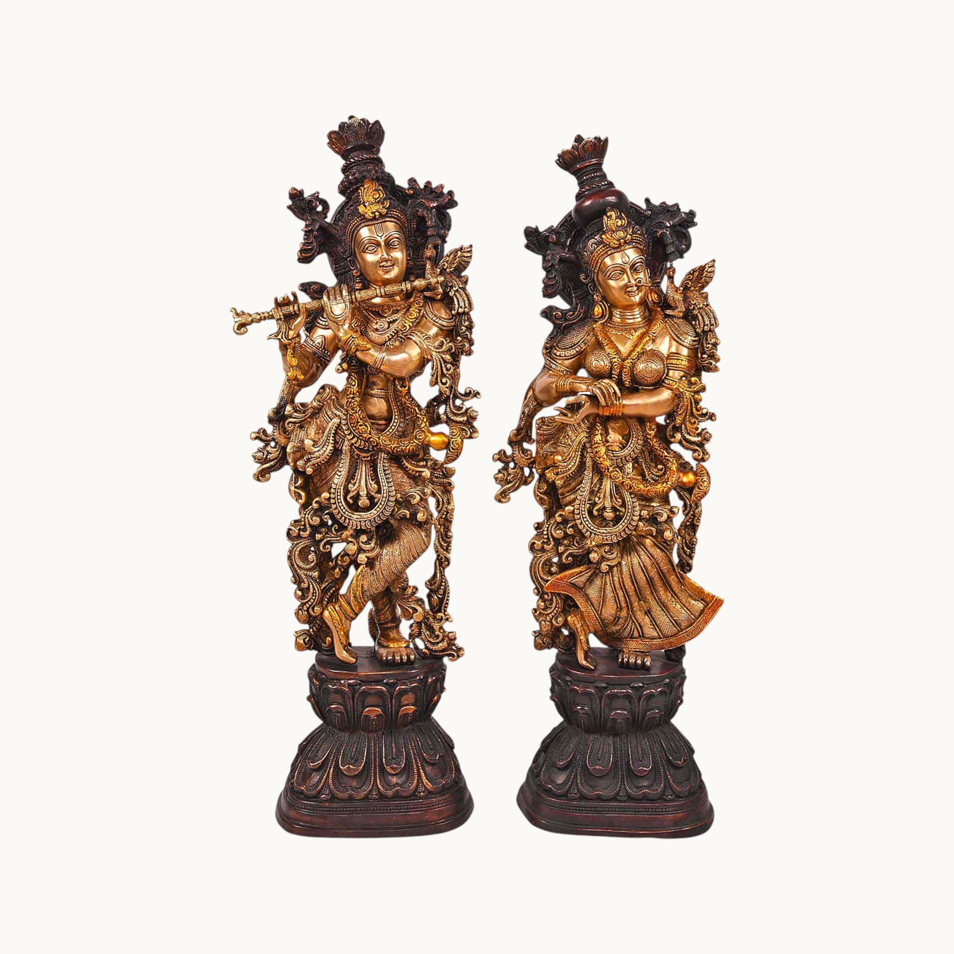 - Design: Crafted in brass with intricate details, depicting Radha and Krishna standing or seated together, often with Krishna playing the flute, symbolizing their divine love