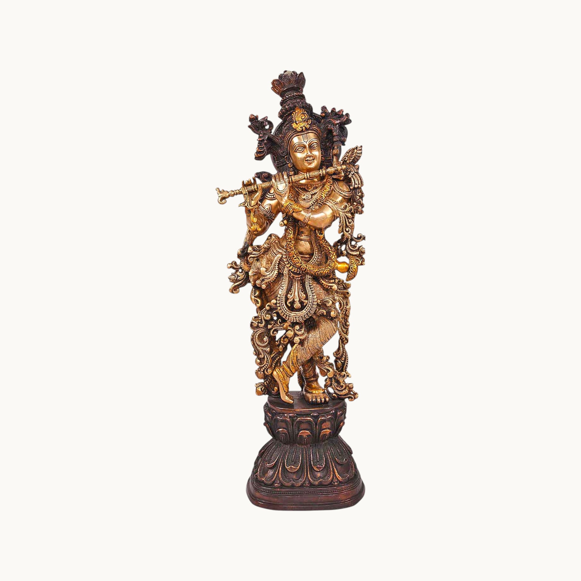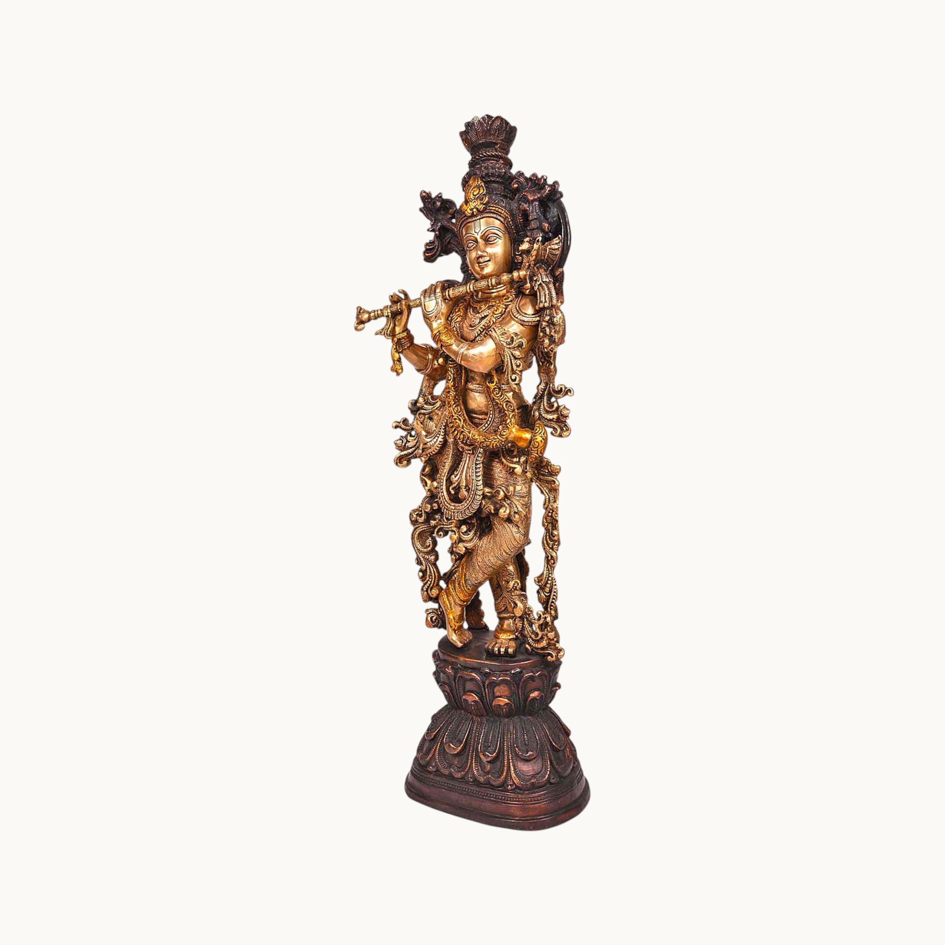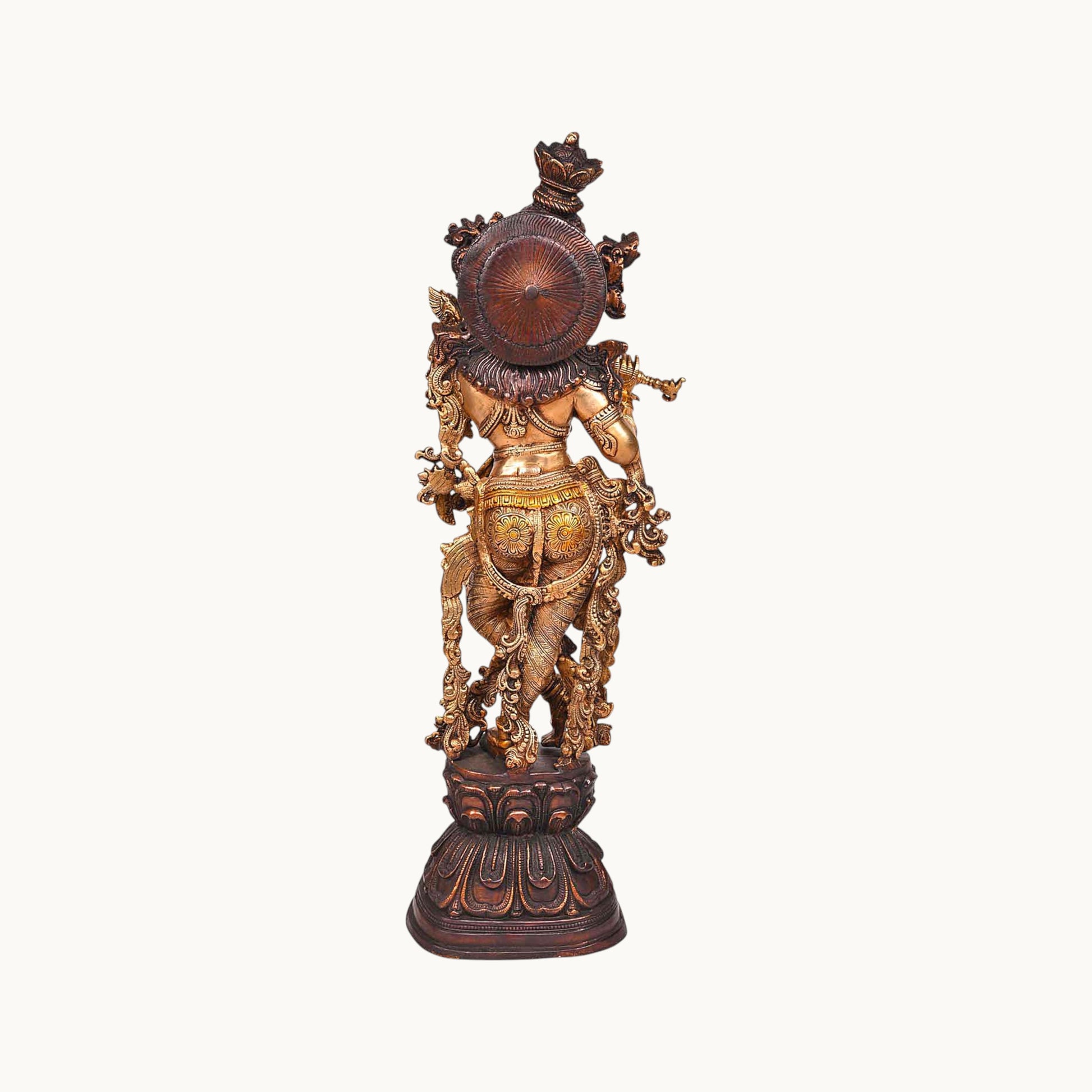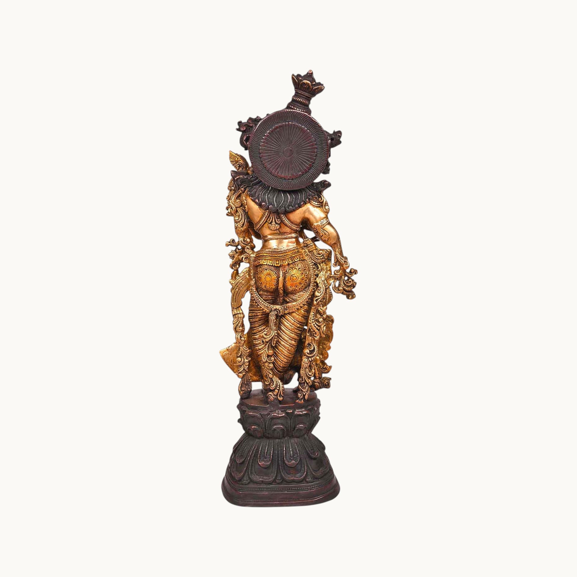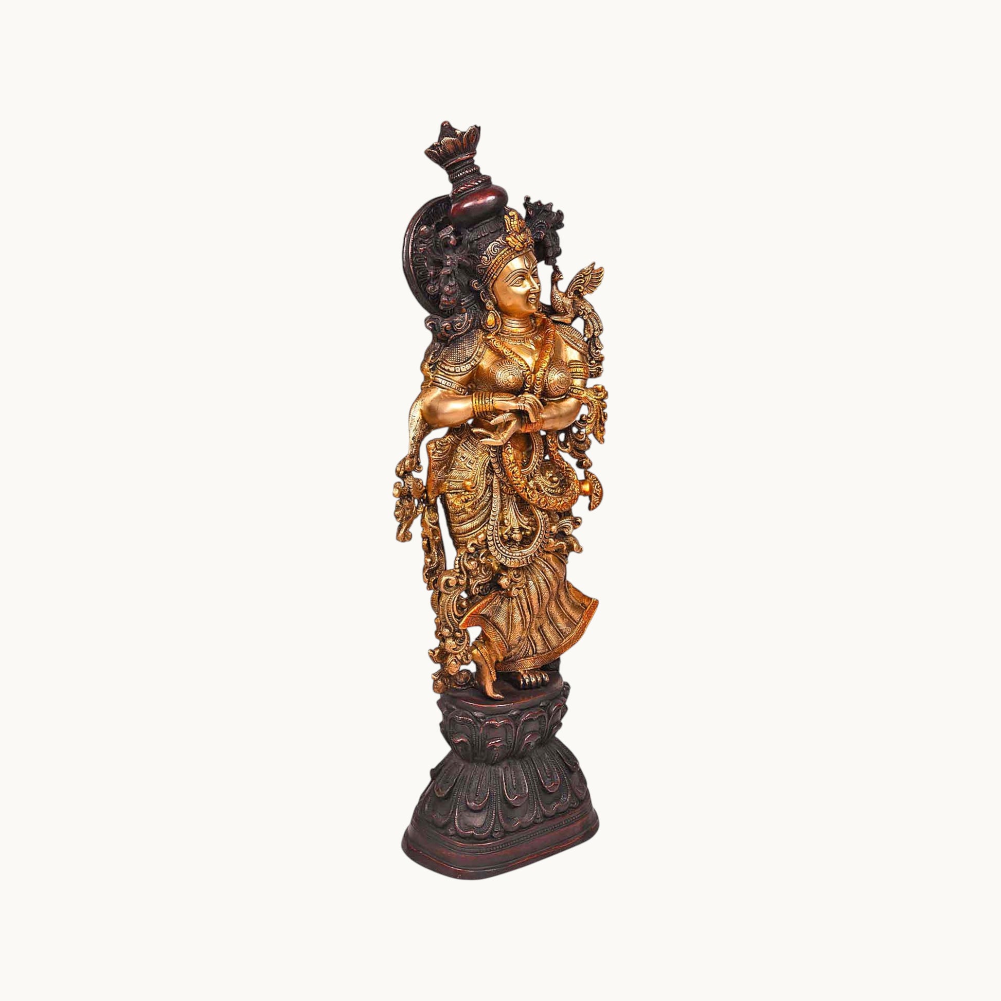 - Design: Crafted in brass with intricate details, depicting Radha and Krishna standing or seated together, often with Krishna playing the flute, symbolizing their divine love