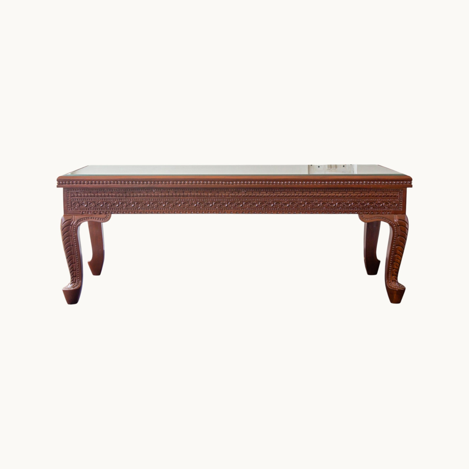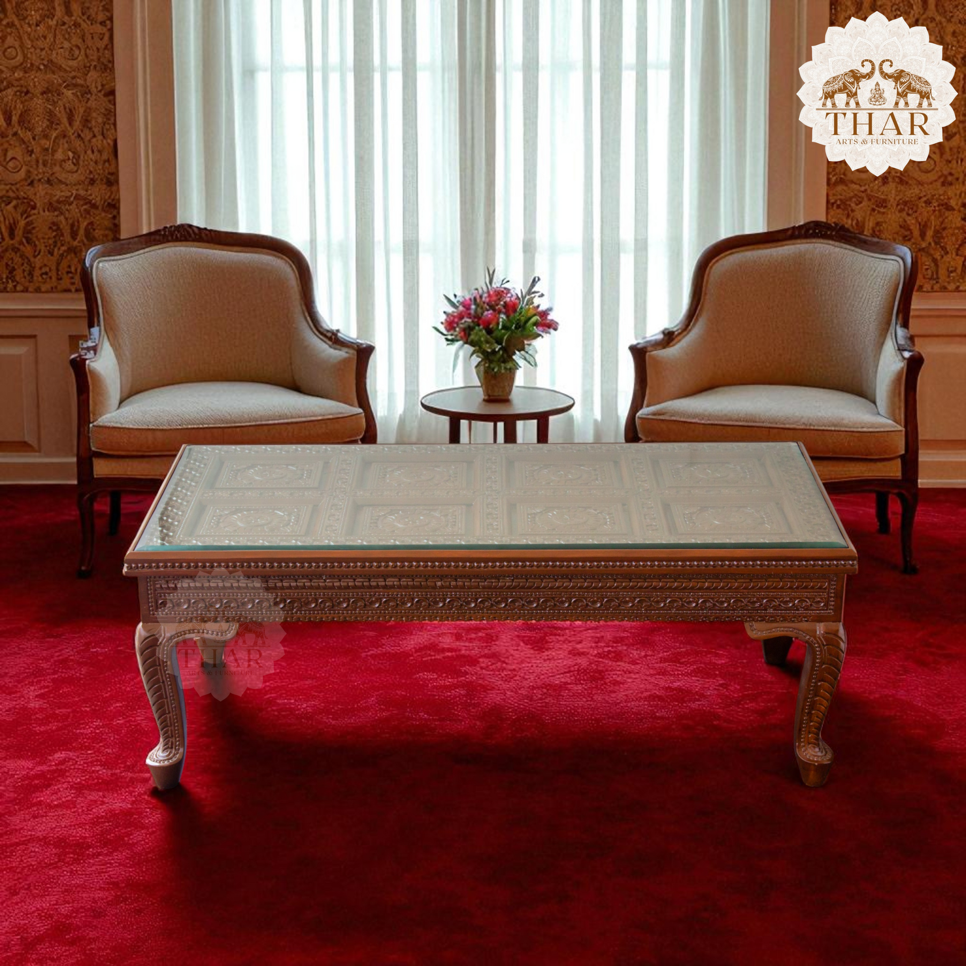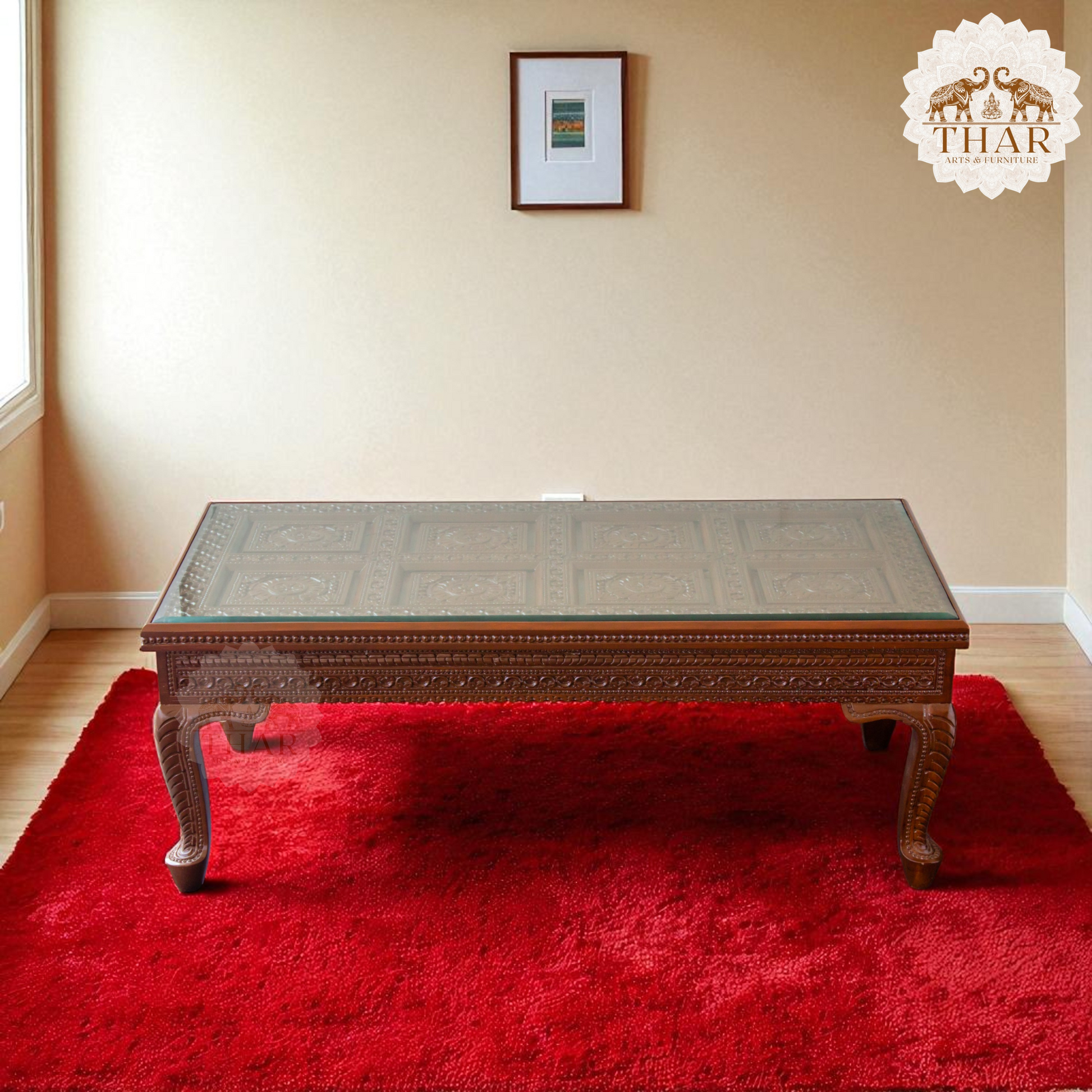 - Design: Hand-carved coffee table featuring traditional motifs and a smooth glass surface, blending elegance with craftsmanship