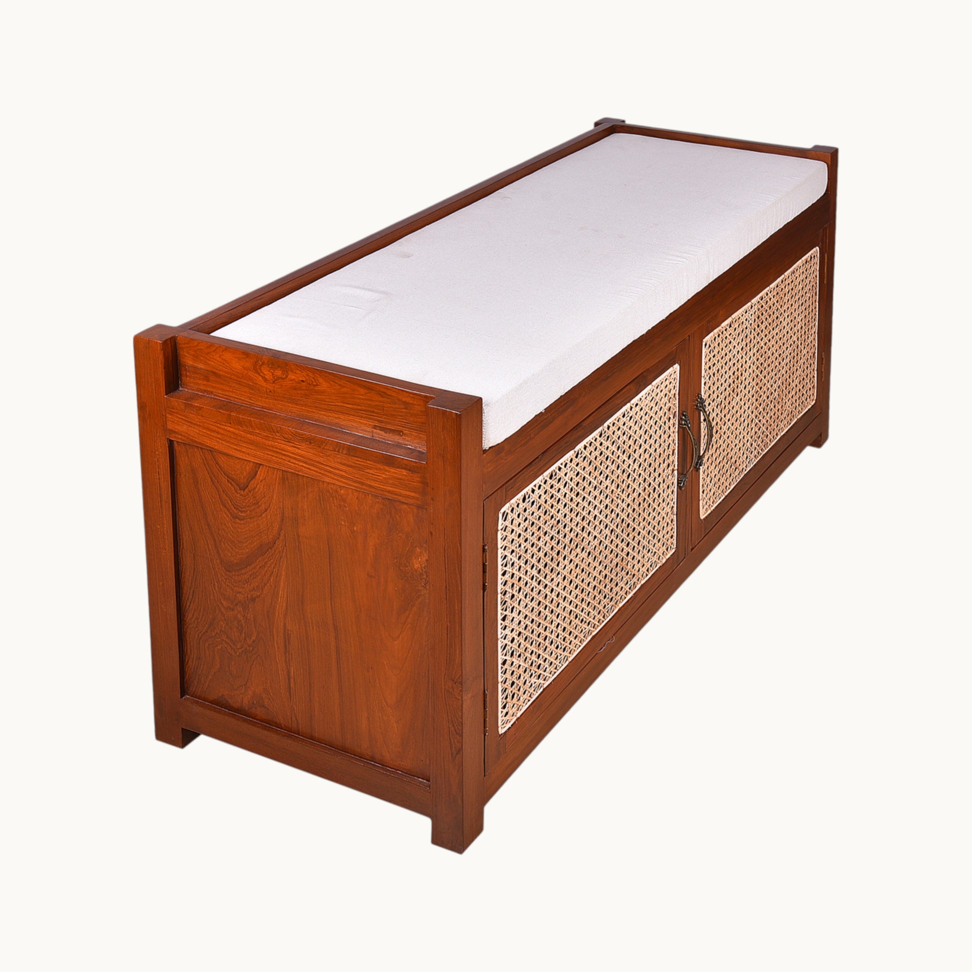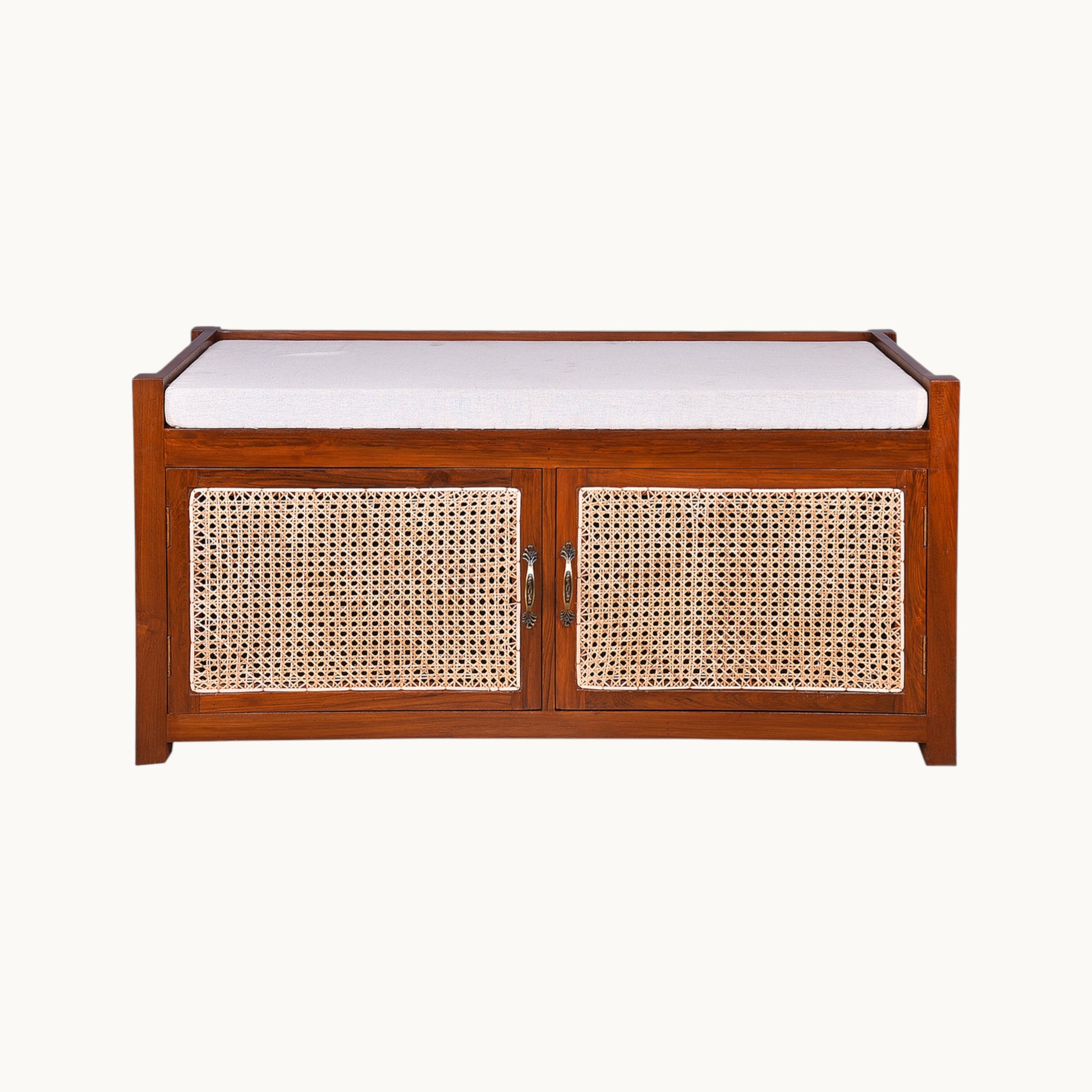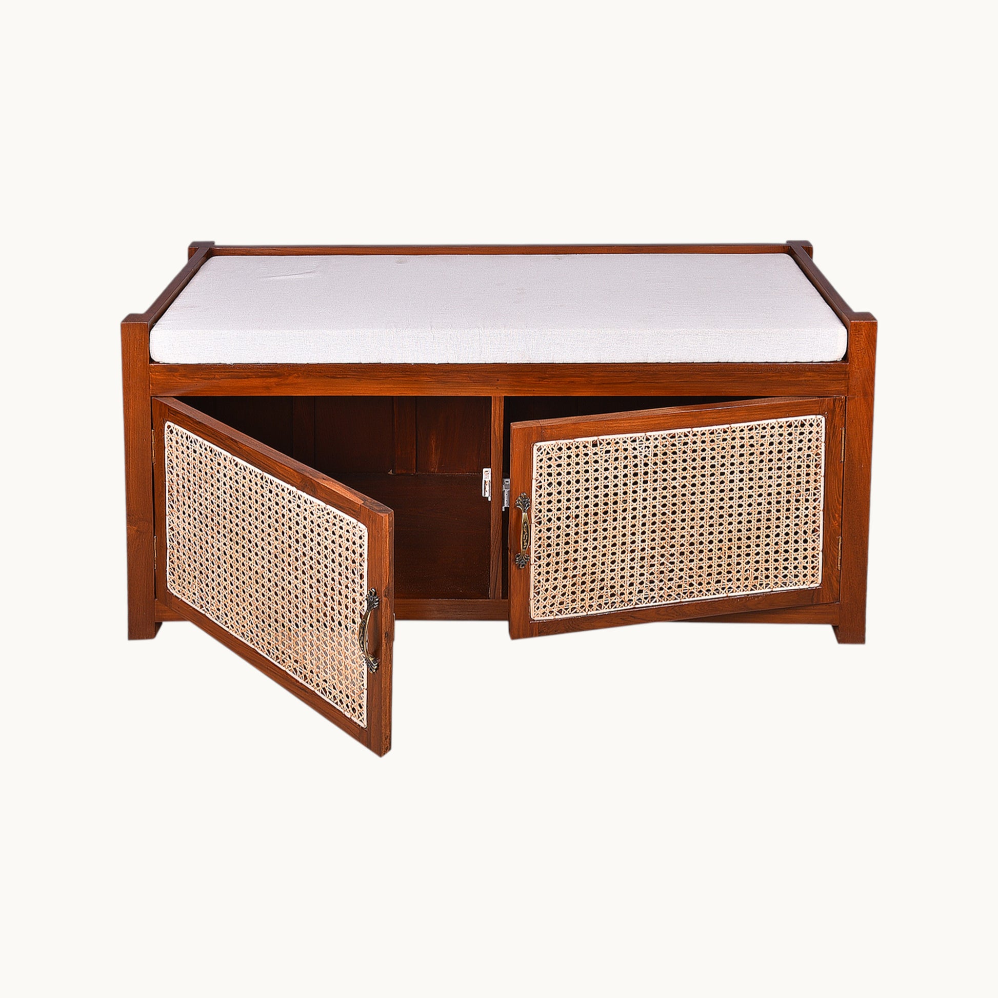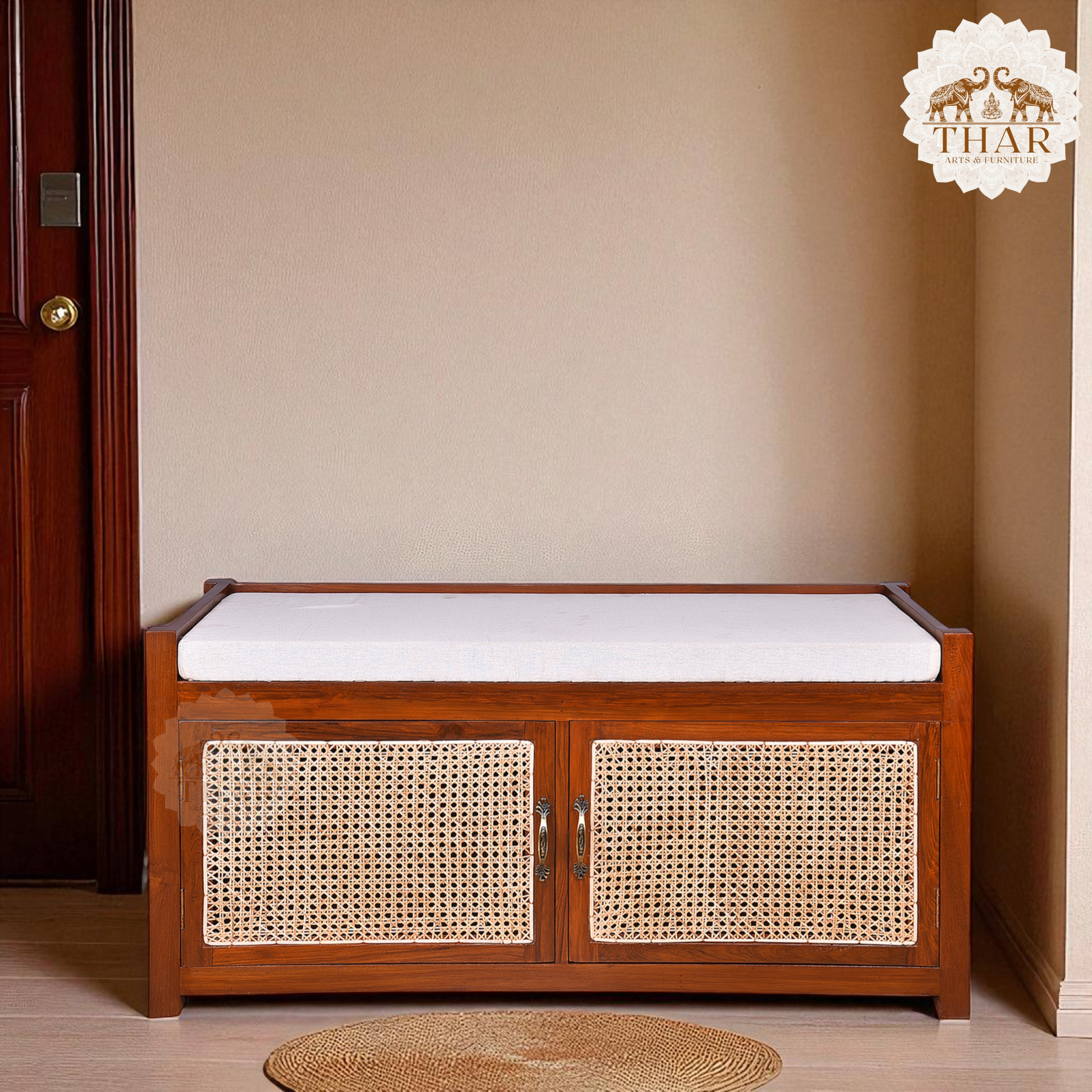 Thar Arts And Furniture - Teakwood Shoe Rack/ Bench with Cushion, 2 Door Storage Shelf and Cane Finish ( Rattan )