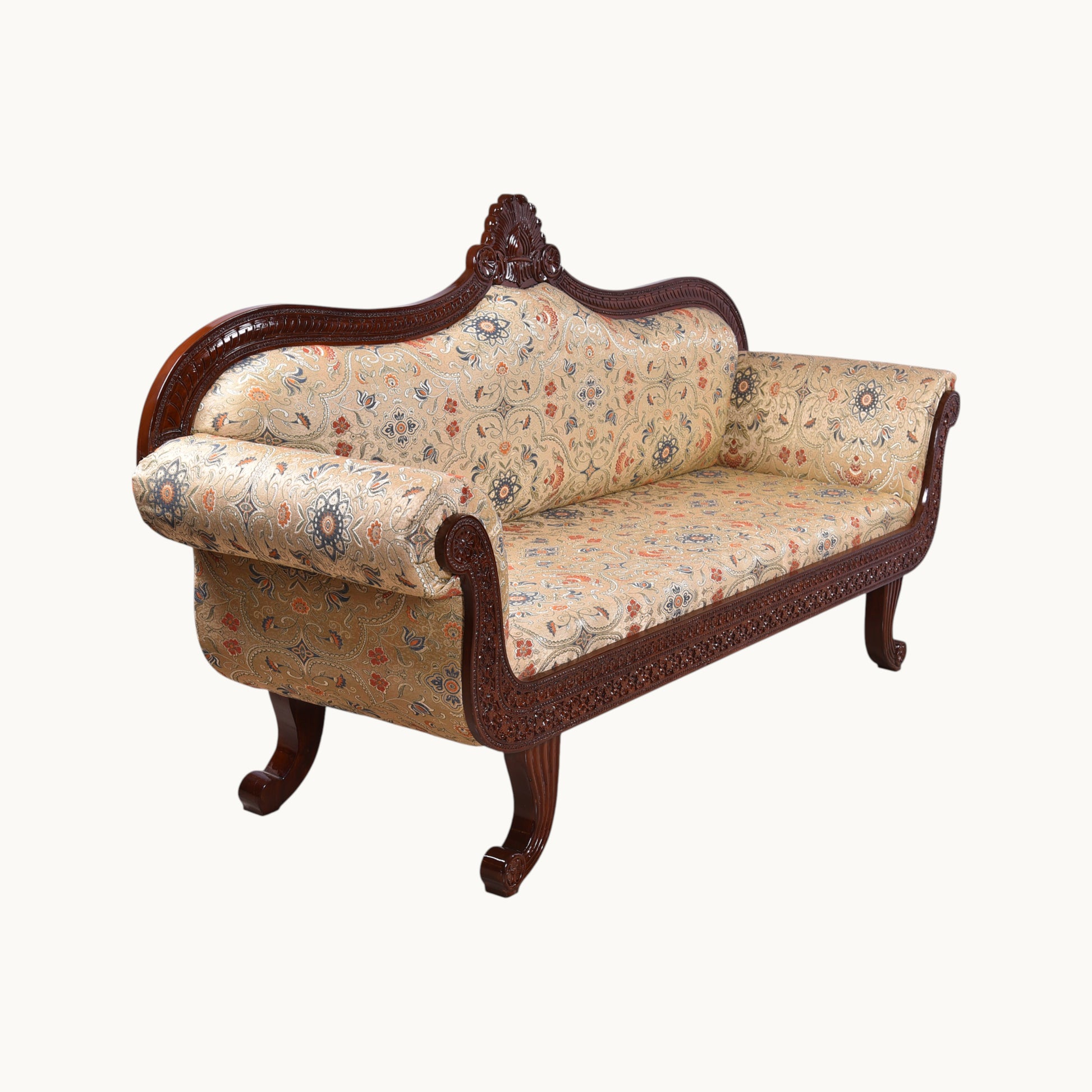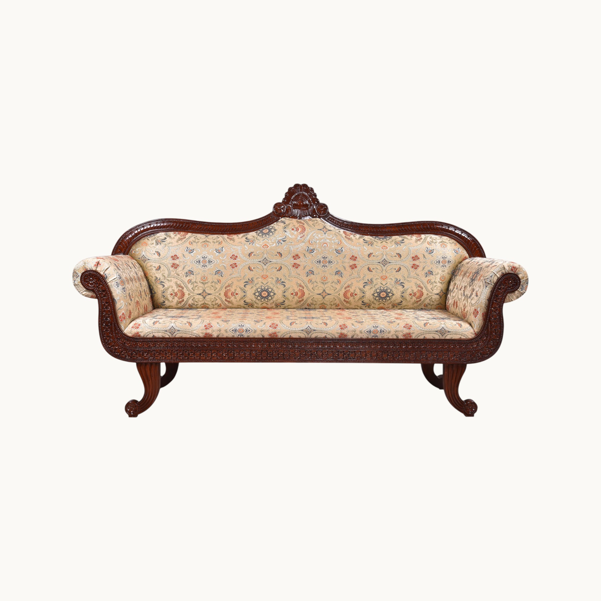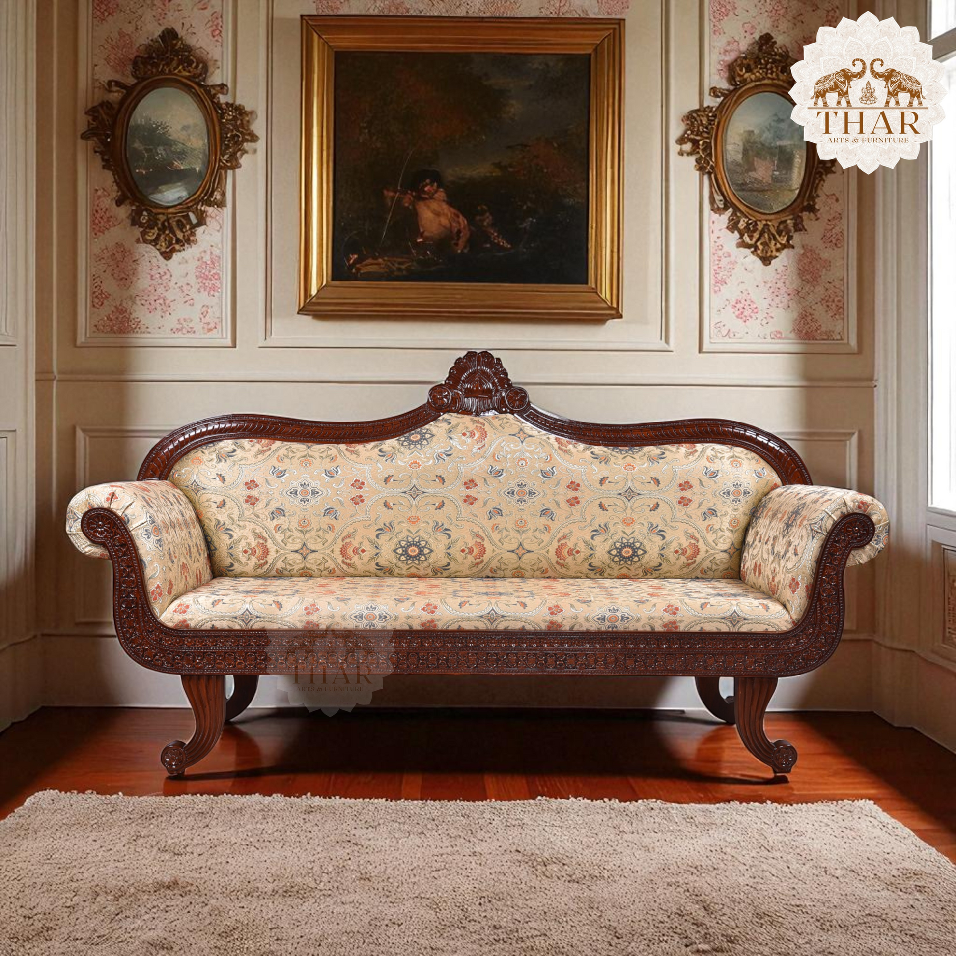 Thar Arts And Furniture - Traditional Sofa, Carved Wooden Frame, Floral Upholstery, Brown Wood Diwan/Couch for Living Room
