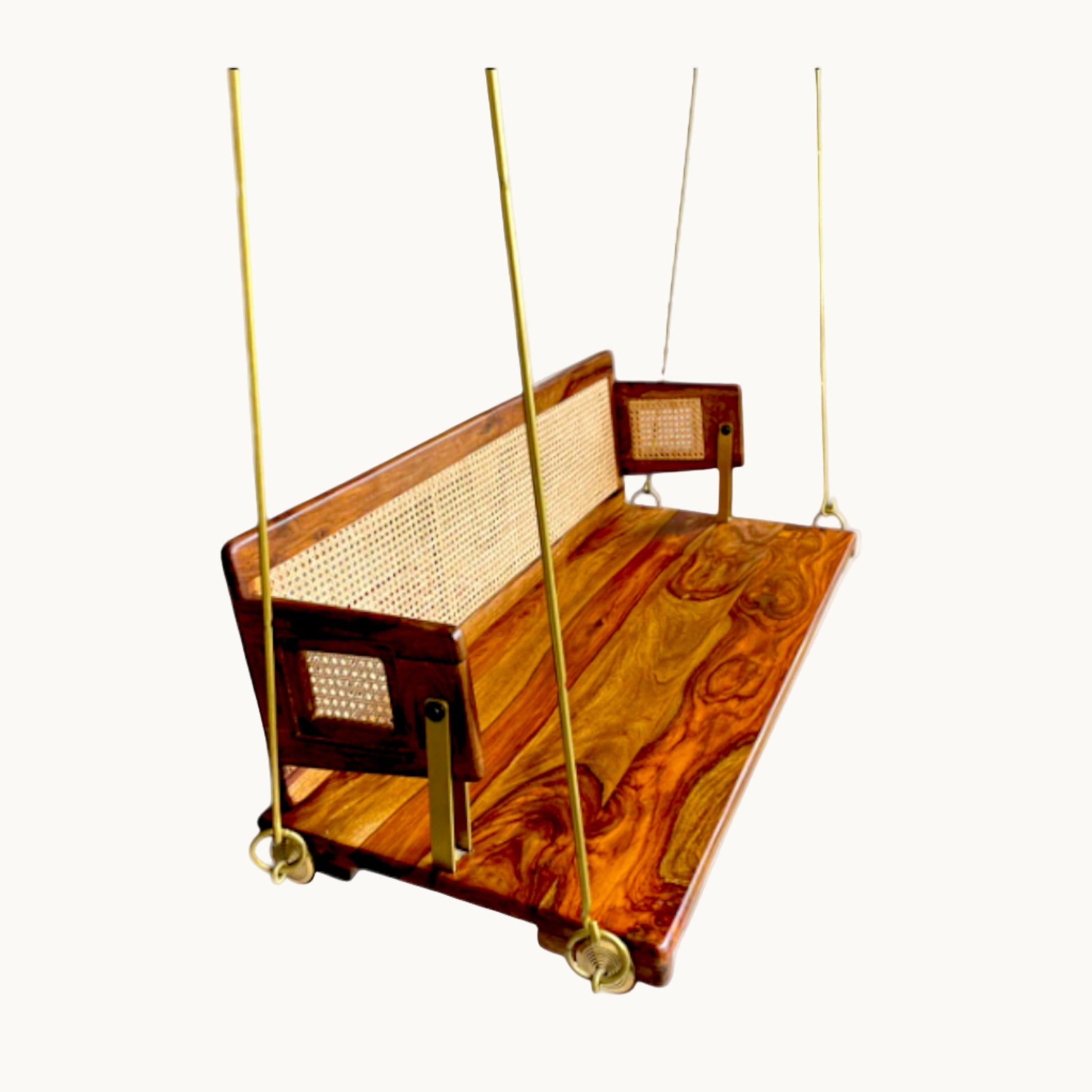 - Design: Modern yet timeless rectangular swing with smooth polished wooden seat, cane detailing for breathability, and brass-toned suspension hardware for added elegance