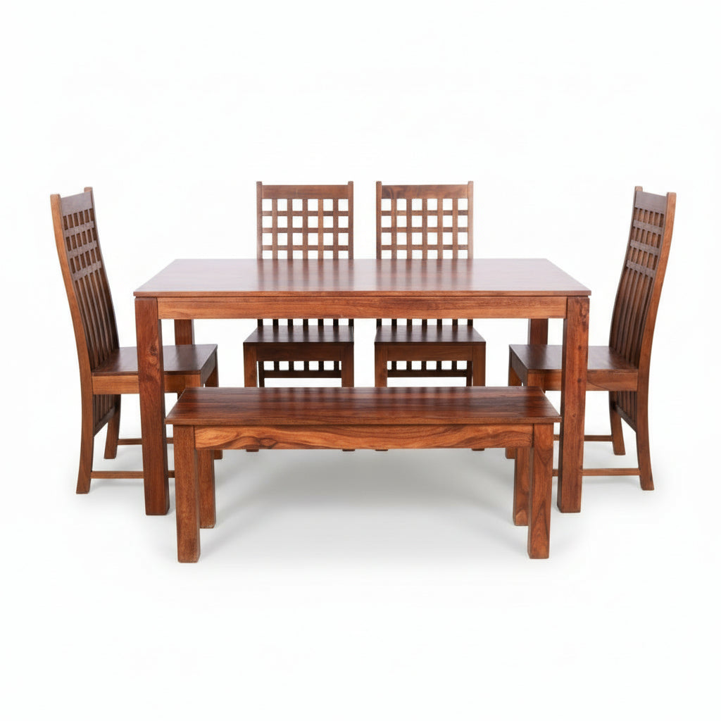Solid Sheesham Wood Dining Table Set with Bench & Lattice Back Chairs – 6 Seater | Thar Arts & Furniture